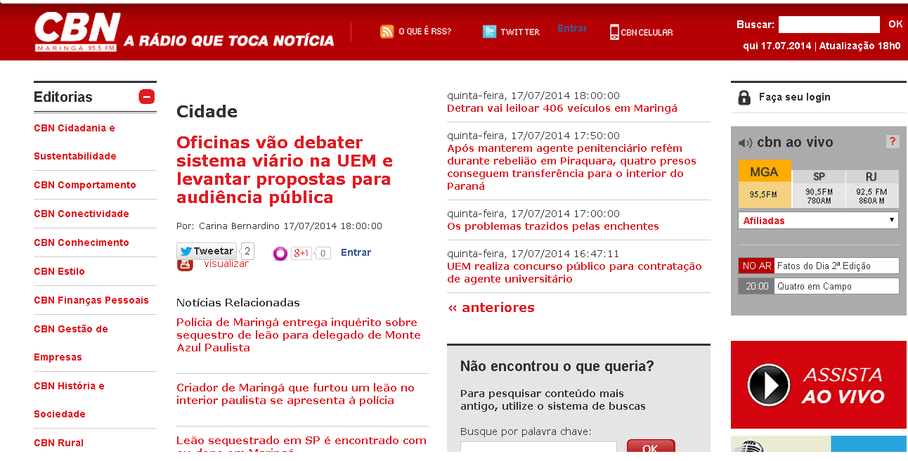 Matéria veiculada na CBN Maringá no dia 17 de julho de 2014